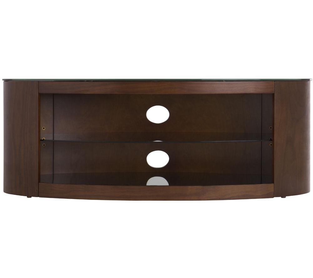 "- The open-shelf AVF Buckingham 1100 TV Stand has a wood veneer and black glass design that adds a touch of style to your living area- It's suitable for screens up to 55"" and 55 kg, along with your consoles, set top boxes and sound equipment- With its gentle curves, this stand fits nicely in a corner or up against a wall - whatever suits your space best- The mesh back has handy holes for cables, keeping everything neat and letting your devices stay cool- You can easily adjust the middle glass shelf to three different heights, making it simple to fit your entertainment gear___Please note: Screen sizes are a guide only, and it's recommended that you measure the width of your TV, particularly if your TV doesn't have a central base. Recommended screen sizes with split feet may overhang the edge of the stand."
