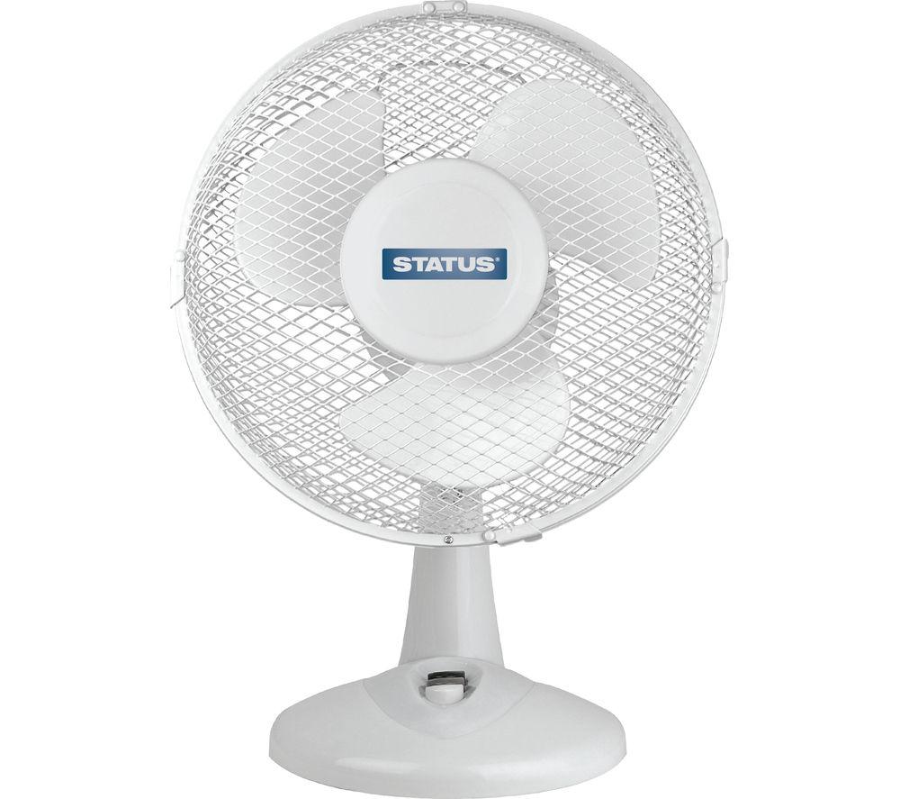 "For a compact, efficient solution to keeping yourself cool, consider the Status 9"" Desk Fan in white.With two different speed settings, you can adjust the fan to meet your personal preference, and it is also possible to adjust the angle to the most comfortable position. The oscillating function allows for a wide distribution of cooling air circulation.At just 9"" it can easily be moved from one room to another, and the 1.8 m long cable means that you can experiment with the placement of the fan in the room.For reliable cooling when you need it most choose the Status 9"" Desk Fan in white."