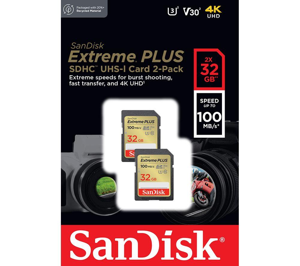 Top features: - Twin pack means you've got even more storage- Record and store Full HD video to capture every detail - Built for extreme conditions so that you can take the memory card with you everywhere you go - Transfer files quickly thanks to a fast read speedTwin packTwin pack of memory card means you've got memory cards for two of your devices. Each memory card has 32 GB for your photos and videos.Record and store Full HD videoThe Extreme Plus allows you to capture cinema quality 3D and Full HD video, reducing dropouts and stuttering thanks to its fast 60 MB/s write speed. Ideal for use with an advanced camera of DSLR, the memory card allows you to take advantage of functions such as continuous burst mode and multiple frames per second.Plus with a large 32 GB capacity, you can store a large number of RAW and JPEG images as well as your Full HD videos.Built for extreme conditionsYou can take the Extreme Plus with you wherever you go as it is durability tested to protect those important memories and files. Take the memory card with you on every adventure, confident that it will remain safe thanks to it being waterproof, shock-proof, x-ray proof and temperature proof.Transfer files quicklyWith a fast read speed of up to 90 MB/s, you can quickly transfer your photos and videos to your computer. Spend less time uploading your photos and more time editing and sharing your memories.