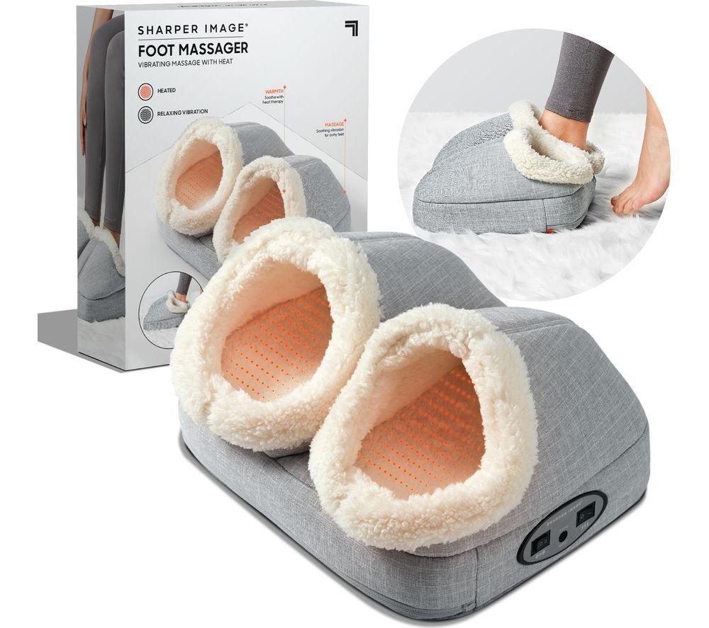 - This Sharper Image foot massager uses heat and vibrations to ease aches and pains in your feet- Use the independent heat function to warm your toes on those chilly winter nights- Its adjustable strength settings let you dial in the perfect amount of vibration- The foot pockets are wide and spacious so you can wear socks without them being too tight- Its non-slip surface means you can relax comfortably without it moving around