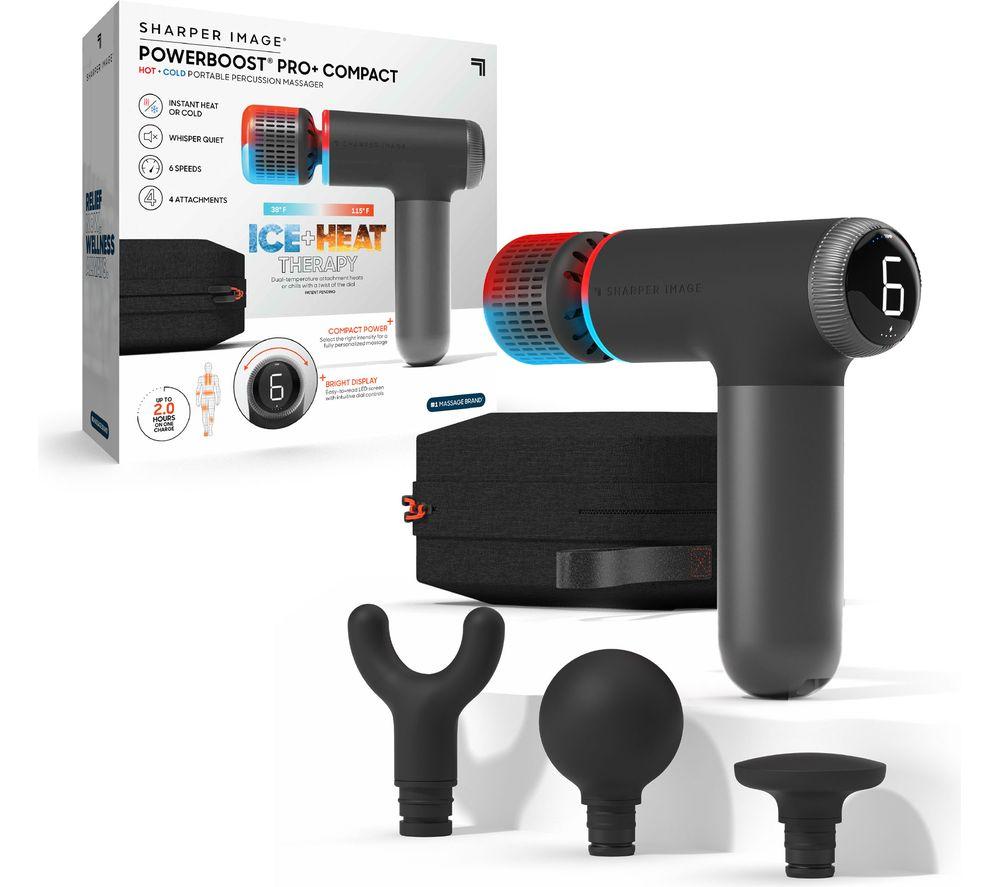Speed up your recovery time with this Sharper Image Powerboost Pro Plus massager. It heats to up to 46ºC or cools down to 3ºC to soothe your achy muscles. Perfect after those high-intensity sessions at the gym. Its brushless motor runs whisper quietly. That means you can enjoy a powerful deep tissue massage without the annoying hammering noise. And it comes with 4 versatile attachments to target different areas of your body. Combine them with one of the 6 intensity settings and enjoy a personalised massage anywhere.Good to know- It uses percussion therapy to soothe aches and pains and boost performance- The ergonomic design lets you keep a firm grip on it while you're using it- It's lightweight and compact - put it in your gym bag or suitcase and take it anywhere- The included carry case lets you safety store the massager, attachments and charger together