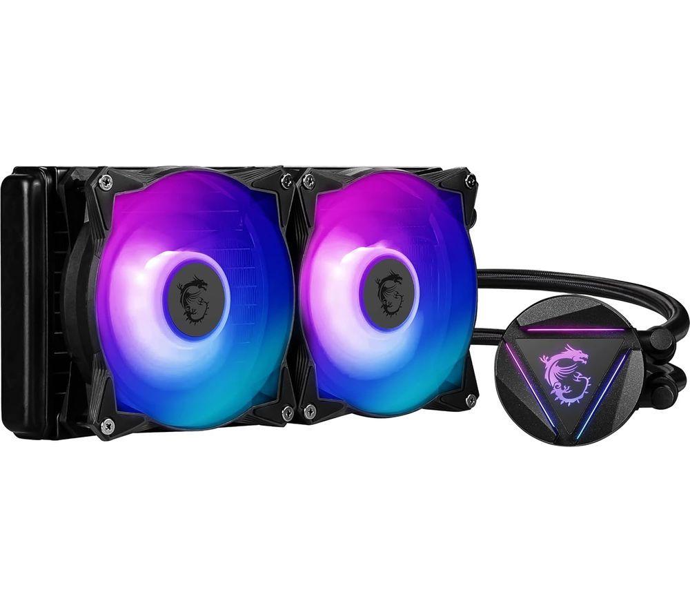Keep your CPU temp in check with this MAG CORELIQUID. It has two powerful 120 mm RGB fans, perfect for keeping the 240 mm radiator nice and chilled - it has 12-pathway design, so it dissipates heat really fast. Don't worry about the noise as vibration-damped pump motor reduces it to a minimum - you'll barely notice it going off. Good to know - The fans and waterblock have RGB LEDs which you can sync with Mystic light for some cool effects- Its large copper plate fully covers the CPU for faster heat loss - You can rotate the blockhead to sit on your CPU the right way up - The evaporation proof tubing makes sure that no liquid escapes the cooler even when things get heated- It's compatible with a whole bunch of sockets, including Intel's and AMD'd latest LGA1700 and AM5
