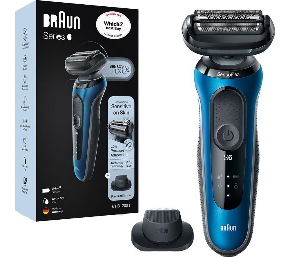 Braun's Series 6 shavers help you look and feel your best. SensoFlex technology adapts pressure and minimizes irritation even on the most sensitive skin. That means you'll get a clean shave without the nasty itching and stinging. It comes with a trimmer attachment too, so you can create those perfect shapes and contours. Good to know- Feel free to use it on dry skin or in the shower - it's 100% waterproof - Maintainance is a breeze thanks to EasyClean system- The 50-minute runtime is plenty for a stress-free shave and you can keep tabs with the LED battery indicator- AutoSense tech adapts every stroke to the thickness of your beard - that makes the trimmer more efficient and gentler- No charge? No time?! Don't worry - there's a 5-minute quick charge- A travel case is included so there's no excuse to look rough when you're on the road