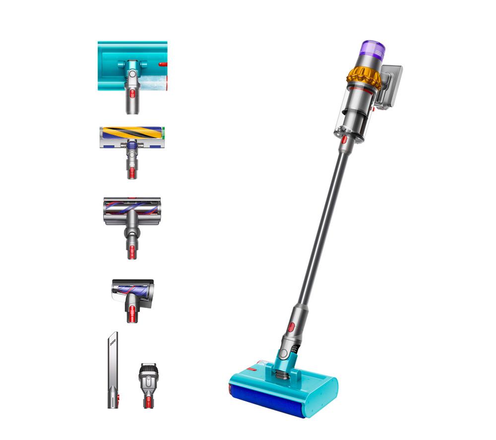 If you live with kids, pets or other mess-magnets, vacuuming alone just won't cut it. This Dyson V15's Submarine wet roller head picks up dirt, debris and liquid - perfect for muddy paw prints and dinner spills. Your floors may look clean, but that's only half the story. The Fluffy Optic cleaner head lights up hidden dust and dirt on your hard floors so nothing gets missed. And the hair screw tool picks up long pet hairs that get caught up in your carpets and rugs. Its anti-tangle technology spirals the hairs into the bin which means there won't be any icky manual unclogging.Good to know- The Digital Motorbar cleaner head's nylon bristles get deep into your carpets for a thorough clean- A piezo sensor counts and measures the dirt and ramps up the power if you're in a particularly grimy spot- You get up to 60 minutes of fade-free suction on a single charge - blitz the whole house in one go- See scientific proof of just how much dirt you've picked up on the LCD screen- Strike the perfect balance of performance and run time with the 3 power modes - Auto, Eco and Boost- Get into those awkward nooks and crannies with the combination and crevice tools