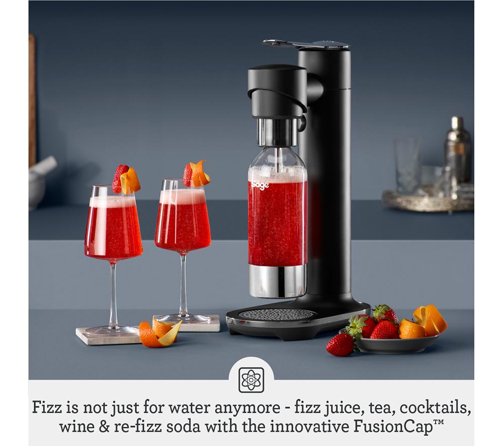 Add a little sparkle to your day with this Sage InFizz Fusion. Its FusionCap lets you control the flow of CO2 depending on the drink and how fizzy you want it. It's not just for water though. Add some fizz to your favourite juices, teas, cocktails and wines too - perfect on those warm summer evenings. And its unique locking system and ergonomic ring pull make it quick and easy to use. Just twist, lock and enjoy the bubbles.Good to know- It stays carbonated so you can make your drink and enjoy it later without it going flat- The magnetic drip tray stays firmly in place to catch any accidental spills- Its modern design has a small footprint so it won't clutter up your countertops- It comes with everything you need including a 1 litre bottle, cleaning brush, funnel and sieve