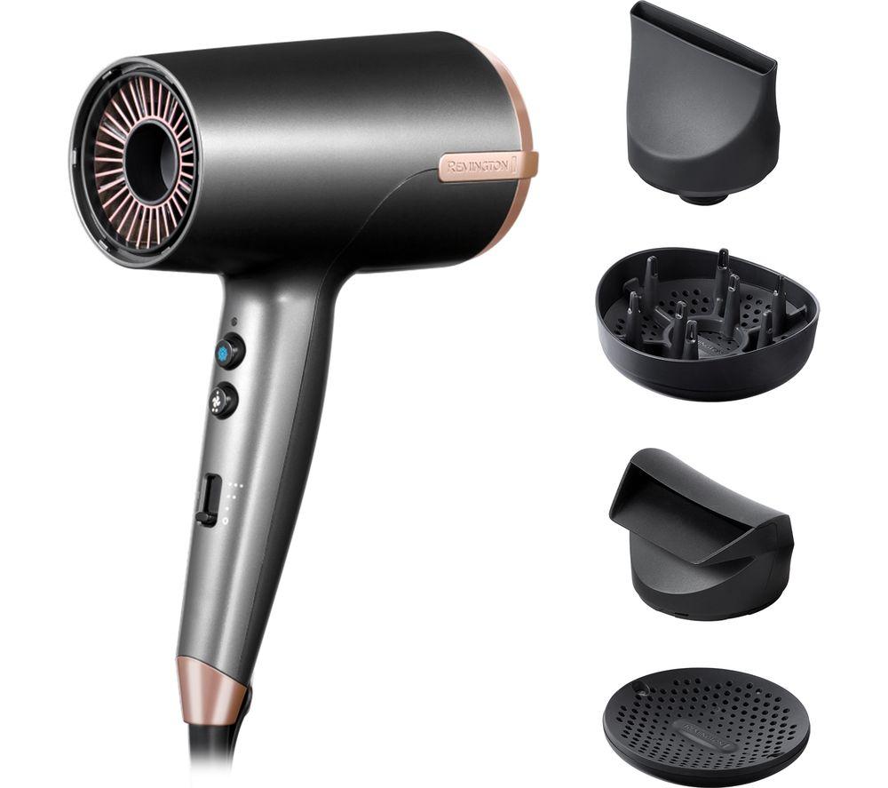 Whether you like it smooth or curly, Remington's One Dry and Style hair dryer has you covered with its 4 styling attachments. There's a Slim Styling Concentrator for precise airflow and a Flyaway Tamer that deals with those unruly strands. Or pick between the Gentle Drying Diffuser to keep your natural shape and texture, or the Curl Defining Diffuser to add bounce. It's packed with tech to keep your hair looking healthy too. Dual ionic technology blasts up to 80 million ions into your hair for a smooth, frizz-free finish. And the Thermacare sensor keeps the air temperature in check, so you don't need to worry about heat damage. Hot (but not too hot) stuff!Good to know- With 2000 W of power, it dries your hair super quick- Pick from 8 heat and speed combos to suit your hair type- Lock in your style with the cool shot - a blast of cool air keeps your hair looking just right- The short, light barrel makes styling easier without feeling heavy- You can tidy it away neatly, thanks to its hang-up loop and built-in cord storage