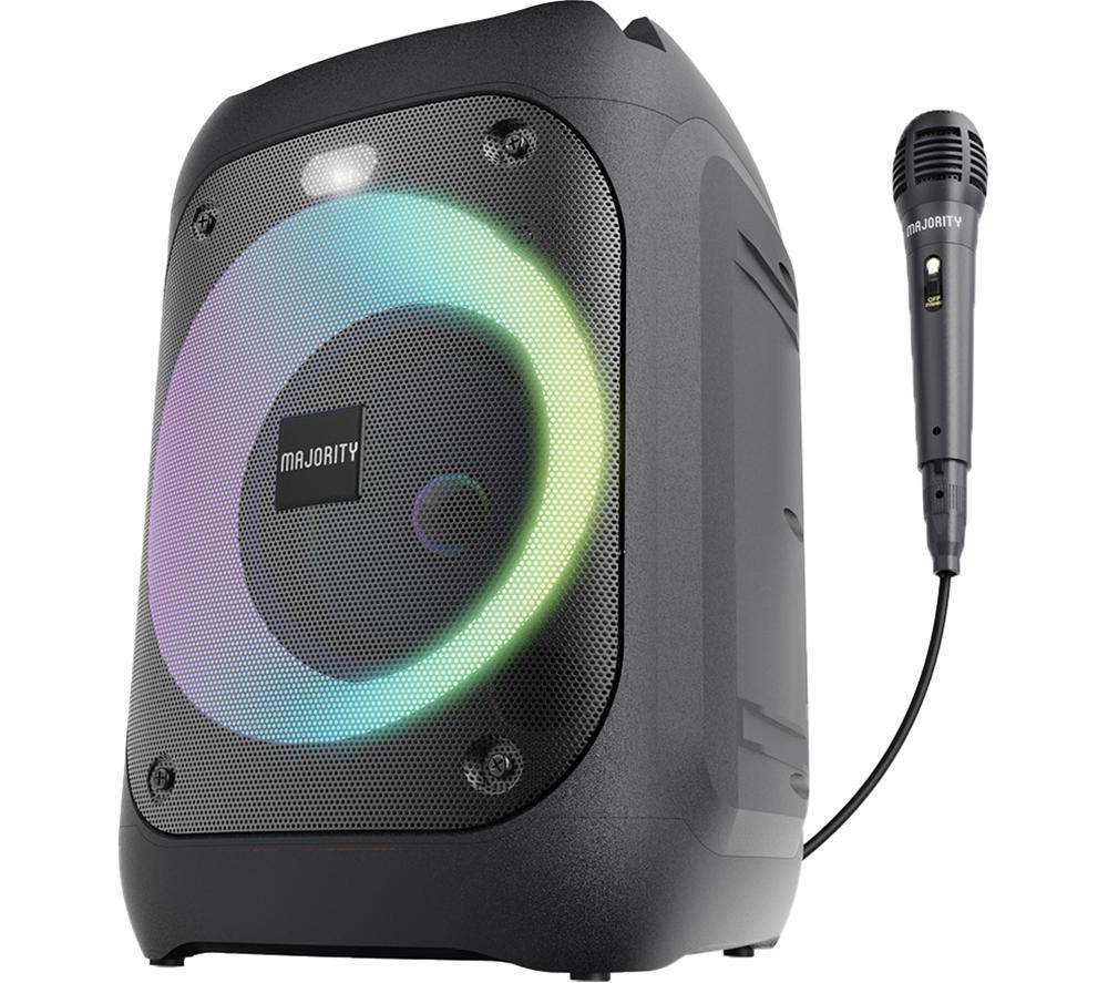 The Majority P100 is the smallest in the P series but still brings the party vibes. You get 50 W of crystal-clear sound - perfect for turning your living room into a dance floor. Need more oomph? You can wirelessly link it up to other Majority P series speakers for bigger sound. LED light rings sync to your music and fill your space with colour. And if you fancy finishing the night with some karaoke, you can belt your heart out with the wired microphone.Good to know- Listen how you like - there's Bluetooth, an FM radio, USB port and microSD card slot- Pick from 6 EQ modes including rock, jazz, and pop- Up to 7 hours of battery life will see you through into the night