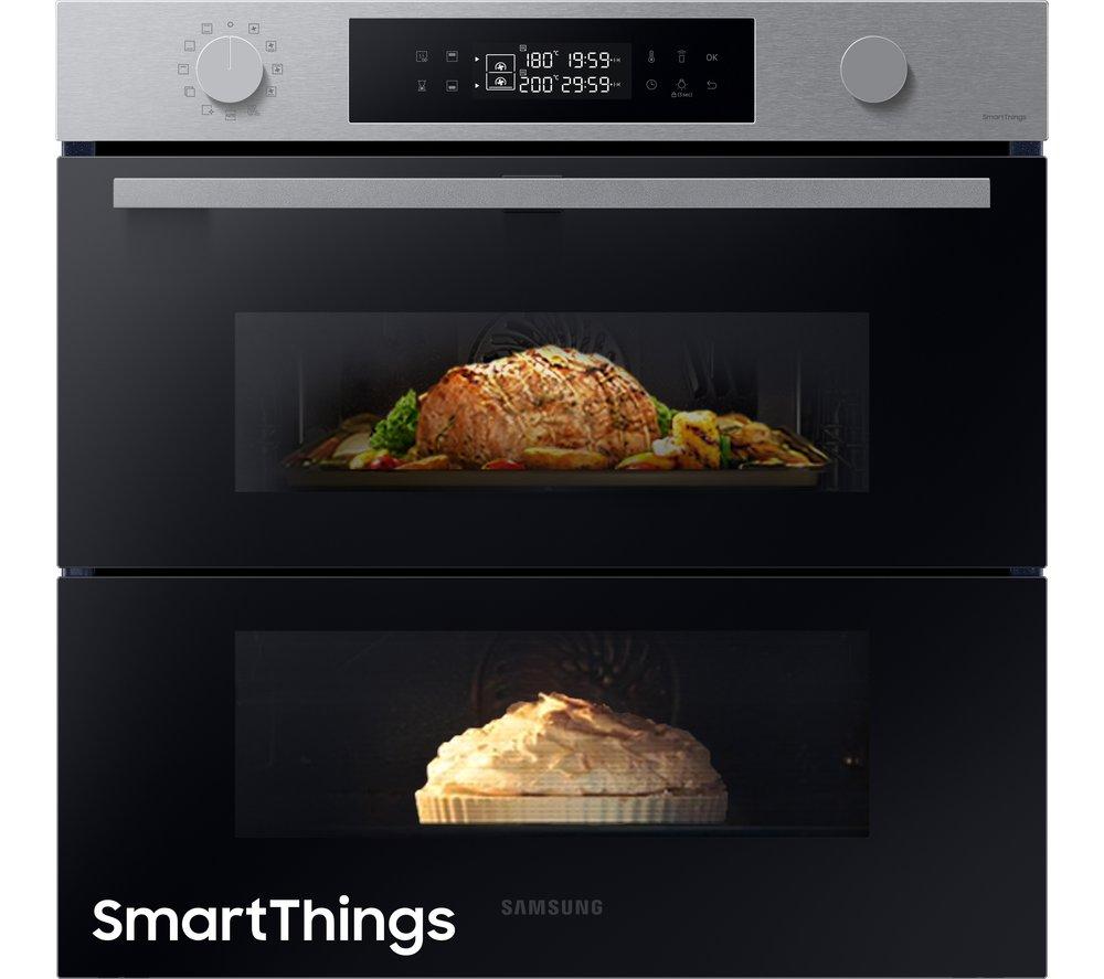 Creating two cooking zones in a single oven sounds a bit like wizardry. But it's easy with this Samsung Dual Cook Flex oven. Bake cookies while you roast a chicken - it won't transfer smells. Dual fans help to waft warm air right through the oven, so everything cooks evenly. The hinged Flexible Door means you can access the whole oven, or just the top half. If you just open the top to peek at a pie, you won't lose any heat from the bottom half. And when you're done, just set the pyrolytic cleaning program. It uses really high temperatures to reduce dirt to ash, so you can just wipe it away after. If you're cooking a smaller meal and don't need the whole oven, Dual Cook lets you save over 25% on energy - and as an added bonus, it pre-heats 52% faster when you're only using the top half.Good to know- By using just the top half of the oven you'll also get faster preheating and reduced energy costs during your bake- SmartThings connectivity means you can get recipe suggestions, guided cooking or even create a weekly meal plan- It's really efficient for a large oven - the A+ energy rating means that it won't cost the earth to run- Enjoy tender, succulent meals thanks to the Air Sous Vide system that stops food drying out- Stop little hands from causing chaos - this Samsung oven has a child safety lockELECTRICAL INSTALLATION: This product requires professional installation to a dedicated circuit by a qualified installer, such as one of our Tech Experts. Our expert installers may be able to install to a dedicated cooker circuit (identified by a big red cooker switch) if you do not have a 16 Amp supply in your home.25.3% energy savings based on internal testing on Series 5 NV7B5675LAK, upper vs. whole compartment for small cake baking at convection 165°C (IEC-60350)Internal testing on Series 5 NV7B5675LAK, upper vs. whole compartment for small cake baking at convection 165°C (IEC-60350)
