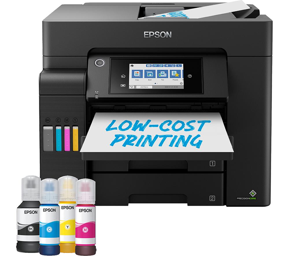 Print, scan, copy and fax wirelessly and save money on every page with the Epson EcoTank ET-5800. With EcoTank there are no cartridges to replace, just large tanks of ink that you top up from low-cost bottles. A full set of inks is included, so you can start printing right away. Thanks to WiFi connectivity, you don't have to be anywhere near the printer to use it. Good to know - Automatic double-sided printing and scanning cuts out the faff and saves you time - With up to 32 pages a minute, you won't have to wait around for long reports to print out - Everything is easy to set up and control on the large touchscreen - you can also print straight from a USB drive - Use the Epson Connect app to print from anywhere right from your phone or tablet