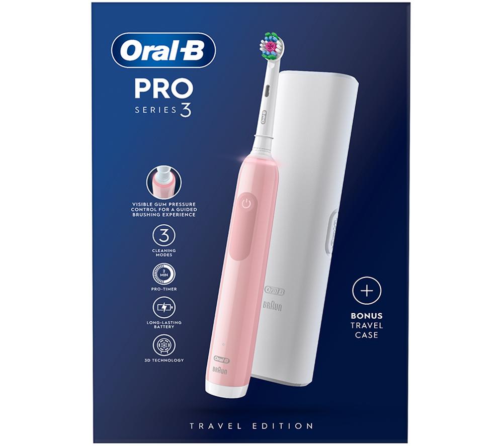 The Oral B Pro 3 3500 Electric Toothbrush removes more plaque than a standard manual toothbrush, making healthier gums and whiter teeth easy to achieve.The integrated timer reminds you to switch areas every 30 seconds. 360° gum pressure control ensures your gums stay healthy - when the sensor detects you're brushing too hard, the band around the handle turns red and brush speed slows down automatically. And as the Pro 3 3500 removes surface stains, your smile will get visibly whiter, too, starting right on the first day of brushing.The Pro 3 3500's battery lasts for up to 14 days on a single charge, so just pop it in the travel case and take it on the road with no worry.
