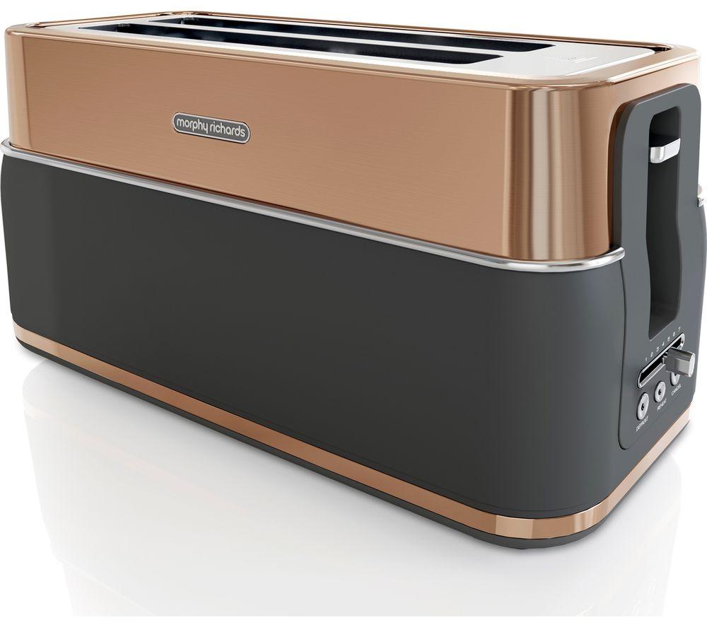 Create your perfect toast with the handy Morphy Richards Signature Opulent 245742 4-Slice Toaster, with extra-wide slots for thick slices of your favourite bread, or long slices like paninis and pita bread.You'll be able to ensure nothing goes to waste as the toaster has a defrost function if you freeze your bread, and a reheating function to warm toast back up.There's a high-lift option so you can avoid burnt fingers removing your toast, and a removable crumb tray to keep things clean and tidy when you're done.For a bit of extra safety, the 245742 also comes with cool sidewalls and the build-in cord tidy enables you to keep your worktop clutter free.