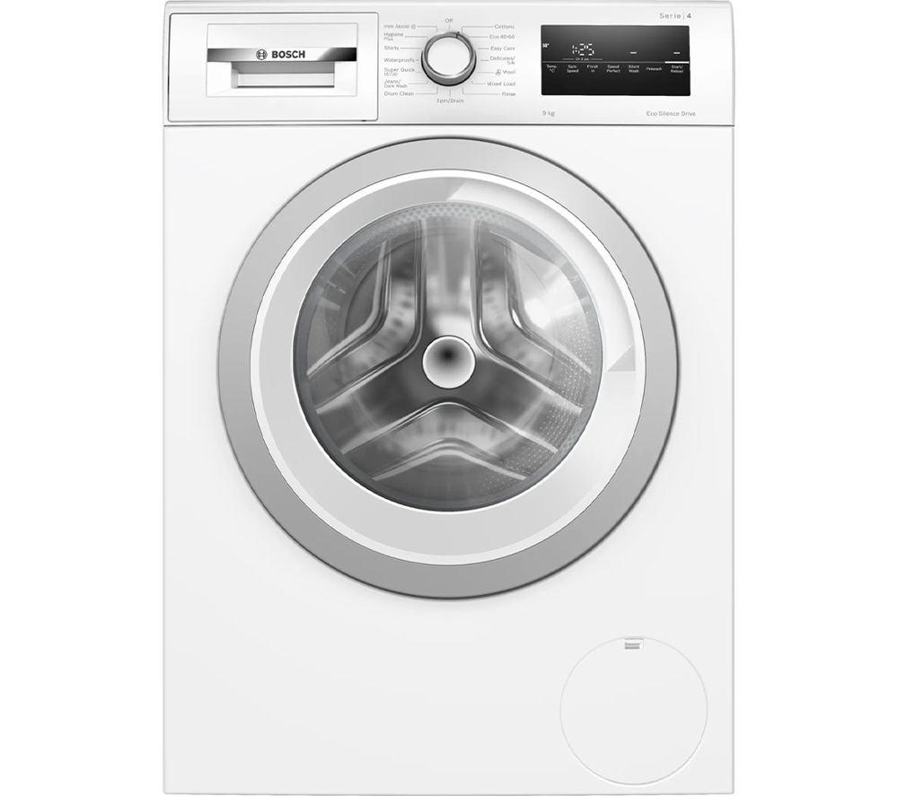 Clean clothes, without waiting around. This Bosch washing machine's SpeedPerfect feature cuts washing times by up to 65%, while still giving uou great results. It can be used with most programs, load sizes and fabrics - great when time's not on your side. It's much easier to pair socks if they're washed together. If you need to add the sock you dropped on the way, use the Reload function to pause the cycle and add it in. No water's wasted thanks to ActiveWater Plus - it uses sensors to detect just how much is needed for each wash. Good to know - Its EcoSilence Drive and Anti-Vibration design mean it won't disturb your evenings with noisy washes - The Allergy Plus cycle is gentle on your skin but so tough on germs it removes 99.99% of them - Save some energy and freshen up lightly-worn items with the Super Quick 30-minute cycle - The VarioDrum makes sure your clothes get a thorough, even wash without stretching or creasing- Iron Assist reduces wrinkles and creases from your clothes so you spend less time ironing them __________ Please note: The HygienePlus wash program at 40° and 60° fulfils scientifically-recommended conditions for 99.99% of germ reduction for Enterococcus Hirae and Pseudomonas Aeruginosa, according to research conducted by the Rhine-Waal University.