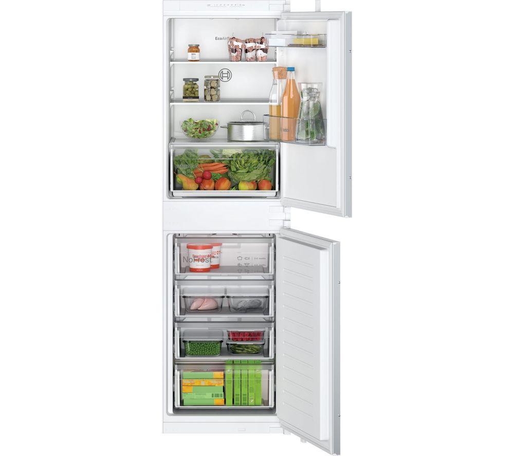 With its FreshSense sensors and SuperFreeze function, this Bosch integrated fridge freezer keeps your food tasting its best for longer.What we love- 249-litre total capacity gives you plenty of room for your weekly food shop- FreshSense sensors constantly monitor and control the fridge and freezer temperatures, so that your food stays fresher for longer- SuperFreeze function freezes any new food quickly, locking in flavour and nutrients- LED lighting illuminates the interior, so you'll have no trouble tracking down treats at the back of the fridgeGood to know- Store all your vegetables and fruits easily in the Extra Large Drawer- No Frost technology saves you the effort of manual defrosting- Adjustable fridge shelves give you more storage options - perfect for when you need to store larger food items- Air cooling guarantees a constant temperature within the fridge, so that your food is always kept chilled_PLEASE NOTE:Use in outbuildings: This fridge freezer is not designed to be used in an outbuilding - both your food and the appliance can be damaged. Do not use it in any unheated area.Reversible door hinges: This appliance has a reversible door. Please consult a qualified installation expert to carry out door reversal - select the door reversal service when you add this product to the basket.