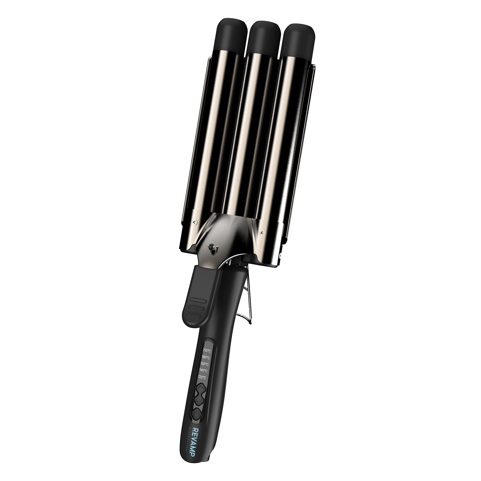 Create flowing, bouncy beach waves that will make the cast of Baywatch jealous. This Revamp beach waver's got both ceramic and ionic barrels so frizziness won't come with you on your trip. The coating is infused with keratin, argan and coconut oils, which protect your hair and give you smooth shiny results. And it heats up in seconds, so you can make waves even when you're in rush. Good to know - Choose from 5 temperature settings to match your hair type perfectly - The 3 m long cord and a built-in stand make for easy and comfortable use - For some extra peace of mind, it auto shuts off after 60 minutes - It comes with a heat resistant glove so you don't have to worry about hurting yourself