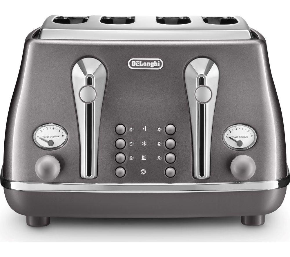 Add an exclusive touch of class to your kitchen with the De'Longhi Icona Metallics CTOT4003.GY 4-Slice Toaster. It'll look great on any kitchen countertop - and you can match it with other items in the Icona Metallics range. With loads of functions available you can toast bread, bagels or a toasted sandwich, defrost any frozen slices and reheat anything you forgot to eat earlier. And if you're worried about a slice getting burnt, the mid-cycle cancel feature lets you save your breakfast.