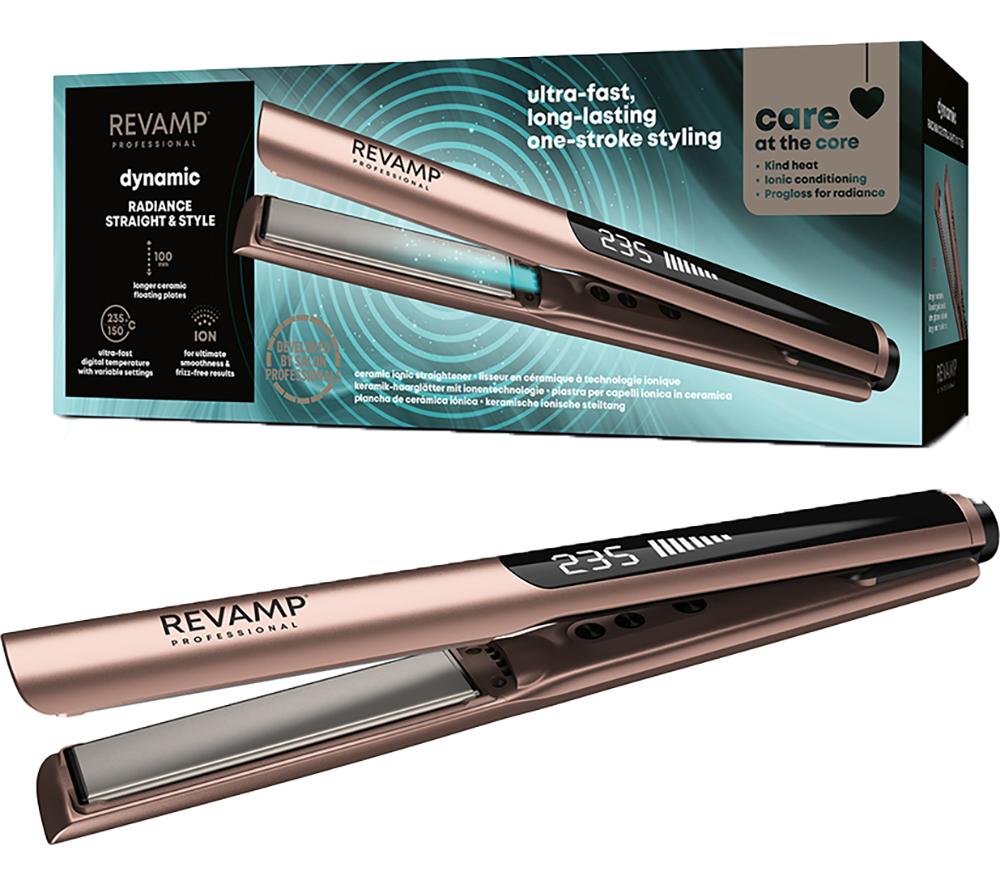 Get shiny styles in just one stroke with this Revamp digital ceramic hair straightener. The Progloss super smooth oils, including coconut, keratin and argan, give your hair extra shine and a healthy glow. With 5 heat settings, you'll be able to create plenty of styles and effortlessly create flawless curls and waves with the curved design.Good to know - With ultra-fast Pro PTC heat technology, you get quick heat up and recovery for one-stroke styling - Wave, straighten, or curl large hair sections with longer plates for quick styling - After 60 minutes, your straightener will automatically turn off, even if you've forgotten about them - The 3 m long cord lets you easily move around while styling without having to sit near the plug socket - The heat resistant mat protects your furniture