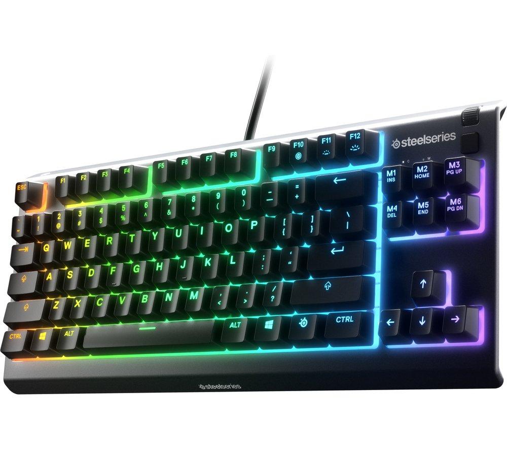 Silent gaming The SteelSeries Apex 3 TKL Gaming Keyboard features Whisper Quiet switches. Its low friction keys won't make much sound even during your most intensive online matches. Every single key is fully programmable, including macros. So you can set up impressive combos easily. And with the gaming-grade anti-ghosting, not a single command will pass unregistered. PrismSync Lighting Want pulsating battle colours or just a mellow ambience? With 8 zones of customisable RGB backlighting, the Apex 3 lets you set effects to match your play style. And you can even make it to react to your games or Discord. Water resistant tenkeyless keyboard The Apex 3 TKL is water and dust resistant, there's no need to worry about accidental spillages. The tenkeyless compact design means there's no numerical keypad - more space for your mouse. Plus, you can route the cable to the left, right or middle, so it always fits your desk setup.