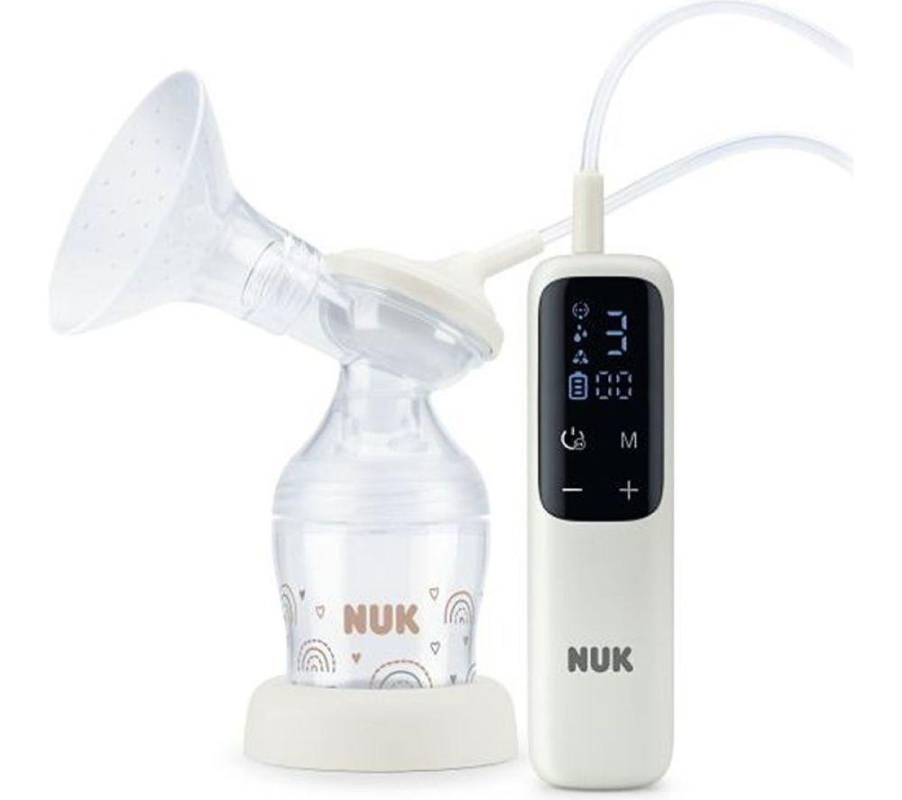 This Nuk breast pump's compact and lightweight design makes it easy to express milk when you're out and about. Plus, it runs whisper quiet so it's nice and discrete. Choose from three programs to mimic your baby's natural feeding pattern, with adjustable suction to minimise discomfort. And it comes with two different sized silicone breast cups (24mm and 27mm), for a comfortable and relaxing session.Good to know- The rechargeable Lithium Ion battery gives you up to two hours of use on a full charge- It's made with BPA-free and soft medical-grade silicone so it's safe and hygienic- The touchscreen remote control unit makes it super simple to use- It includes a Nuk Perfect Match bottle and teat so you can start using it right away