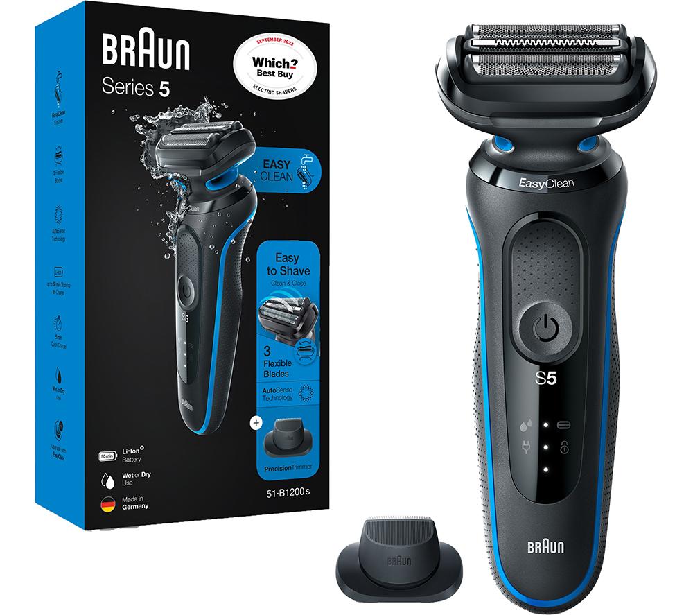 Effortless shavingWith the Braun Series 5 50-B1200s Wet & Dry Foil Shaver, you'll enjoy a smoother, more comfortable shave. Its 3 flexible blades glide across your face, adapting to your facial contours for maximum contact and hair removal.Shave the way you wantIt's 100% waterproof, giving you the freedom to shave your face in the shower or in front of the mirror - the choice is yours. It also has 50 minutes of battery life, so you won't run out of charge halfway through your morning shave.It even fast charges in 5 minutes, giving you enough battery power for 1 full shave.Easy to cleanWash out the Series 5 by rinsing it in some water, you don't even need to remove the shaver head as water runs through the cutting blades to clean them off. This EasyClean system will save you time in the mornings - perfect if you're in a rush to get ready.