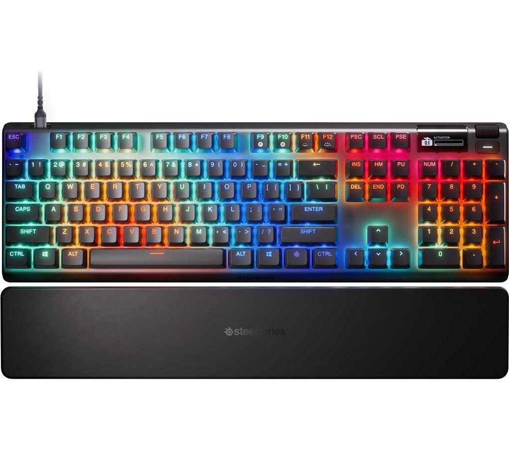 The Apex Pro Gen 3 is packed with OmniPoint 3.0 switches. They're hall effect switches, so they respond 11 times faster than your average mechanical switch. It's okay if you can't keep up. You can tweak the sensitivity of every key, all the way from pro-gamer 0.1 mm to a more careful 4 mm.That variable sensitivity also means you can program every single key twice. Yep, map actions to both a light keypress and a heavy one. Let the combos commence! Good to know - How cool is the OLED Smart Display? Now it's a piece of cake to check and tweak your settings mid-game - Customise the per-key RGB lighting, program your macros, then save it all to the onboard memory - Double-shot PBT keycaps resist getting slippery or shiny, so you stay in control - Your board's legs have three height settings so your wrists can get nice and comfy - there's even a wrist rest included