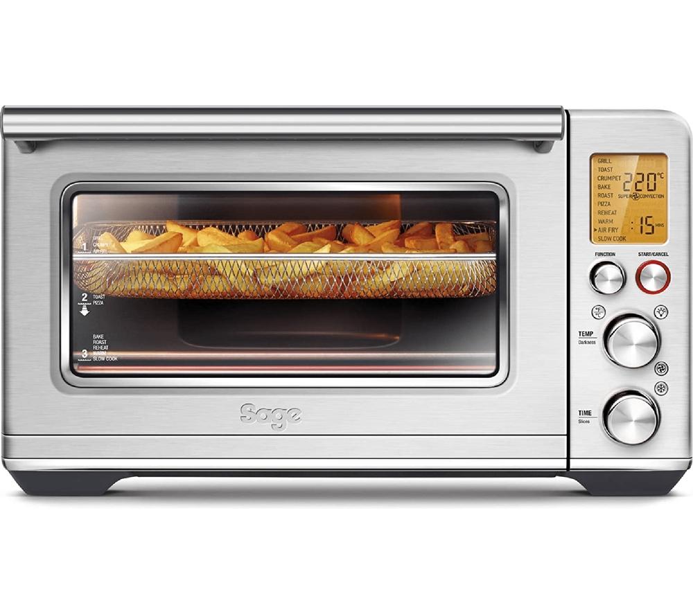 Need some extra oven space in your kitchen? The Sage Smart Oven Air Fryer SOV860BSS Mini OvenĀ is perfect for everything from baking bread to slow-cooking tender meat.Its Element IQ heating system keeps the temperature stable across the entire oven, so your food is evenly cooked on all sides. And the integrated fan and fast pre-heat speed up cooking times, so you can get your meals on the table quicker.With 10 easy-to-use pre-sets, this versatile oven does the hard work for you. Bake cookies, grill salmon, roast chicken and much more. There's even a dedicated slow-cook function that maintains a low heat for up to 10 hours, so you can create delicious stews, casseroles and succulent meat dishes.The clear LCD display makes it easy to choose your settings. And the interior oven light turns on at the end of the cooking cycle, so you'll know when your dish is ready. As a bonus, the oven also has a non-stick coating that makes for easy cleaning.