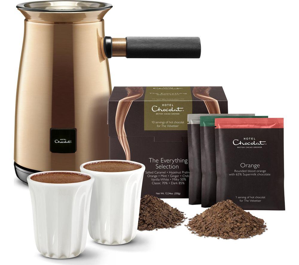 Incredibly smooth hot chocolate Create velvety barista-quality hot chocolate in the comfort of your home with the Hotel Chocolat HC01 Velvetiser Hot Chocolate Machine. It's been designed to serve hot chocolates at 68 - 70°C, which is the melting point for cacao butter. That's the reason why Velvetiser hot chocolates are smooth, creamy and full of flavour. Quick and easy to use Say goodbye to making hot chocolate on the stove or microwave. Simply fill the Velvetiser with your choice of liquid and hot chocolate mix, then turn it on using the one-button control. Two and a half minutes later you'll be enjoying a gorgeous, perfectly made hot chocolate. It's easy to clean thanks to the removable whisk and non-stick coating. Simply rinse with cold water. Everything you need to get started The Velvetiser comes with two ceramic cups and 10 Hotel Chocolat Hot Chocolate sachets. That means you and a friend can try out the different flavours and find your new favourite hot chocolate mix.